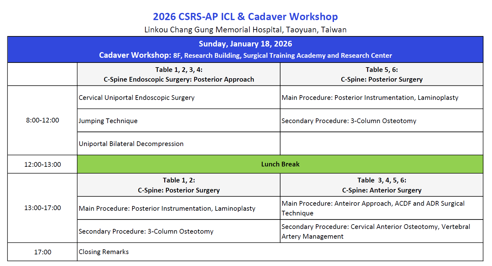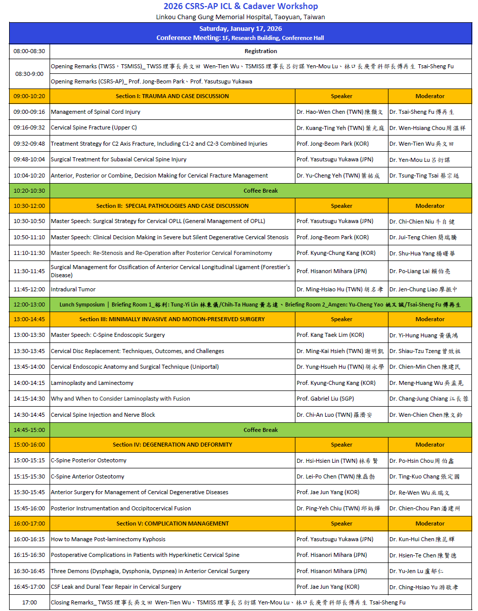 我們誠摯邀請您參加 TSMISS 2026 首場學術會議,本次盛會將與 CSRS-AP ICL & Cadaver Workshop 聯合舉辦,聚焦於脊椎微創手術的最新技術、臨床應用與實作演練。無論您是資深專家或新進醫師,這將是一次難得的學習與交流機會。