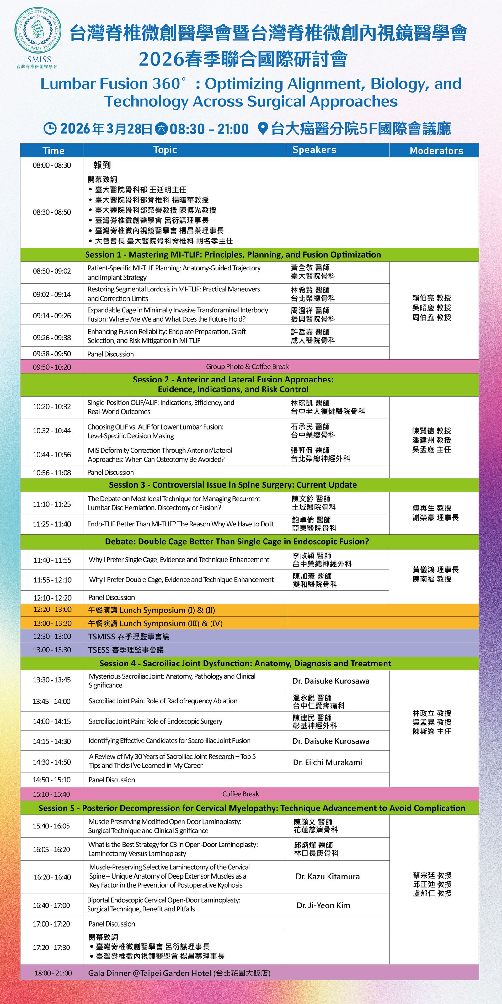 台灣脊椎微創醫學會 & 台灣脊椎微創內視鏡醫學會 2026年度共同春季會暨國際學術研討會 Lumbar Fusion 360°: Optimizing Alignment, Biology, and Technology
